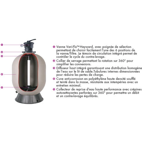 Diffuseur haut intégré garantissant une distribution homogène de l’eau sur le lit de sable.Tubulures internes dimensionnées pour réduire les pertes de charge.